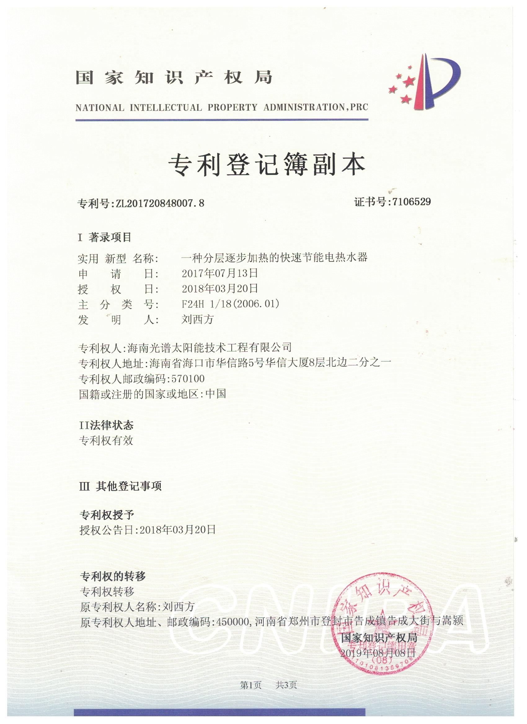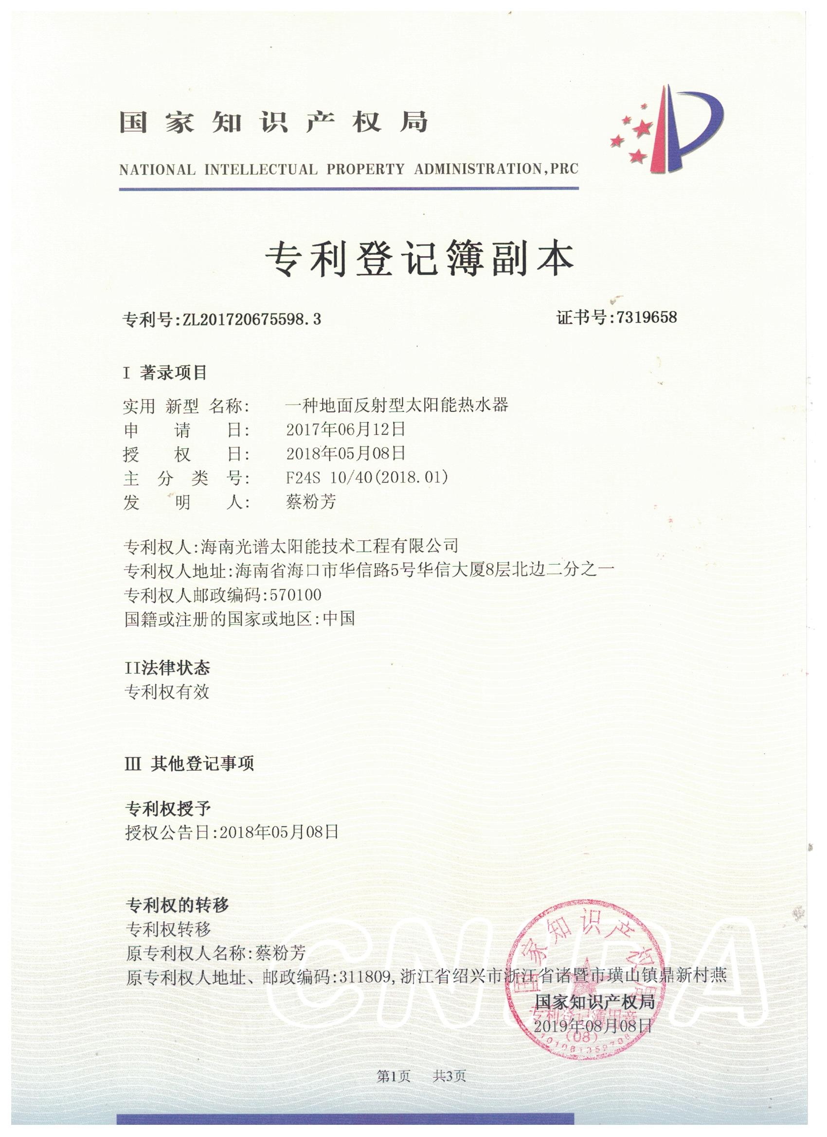 近日,我司申報的“一種太陽能熱泵蒸汽發生裝置”發明專利通過審查,獲得國家知識產權局授予的發明專利證書,授權專利號為“ZL201911126309.4”。 此次獲得國家頒發的專利證書,是對海南光譜公司創新實力的認可,代表著我司知識產權取得了突破性進展,為公司的持續性發展提供強有力的科技創...